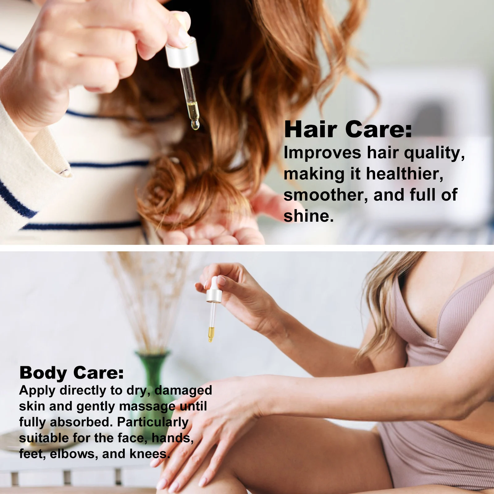 For Hair Care: Apply a few drops to damp or dry hair, focusing on mid-lengths and ends. Gently massage to distribute evenly for healthier, smoother, and shinier locks.