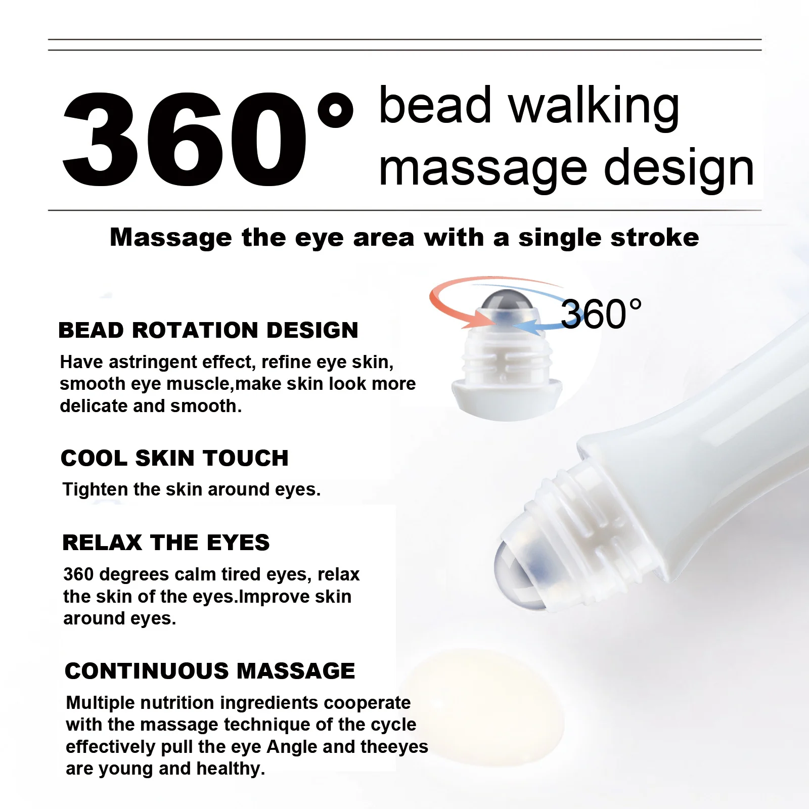 • 360° Roller Ball Massager: Features a cool-touch, rotating bead design for a full contour massage that relaxes tired eyes, improves absorption, and tightens skin.
