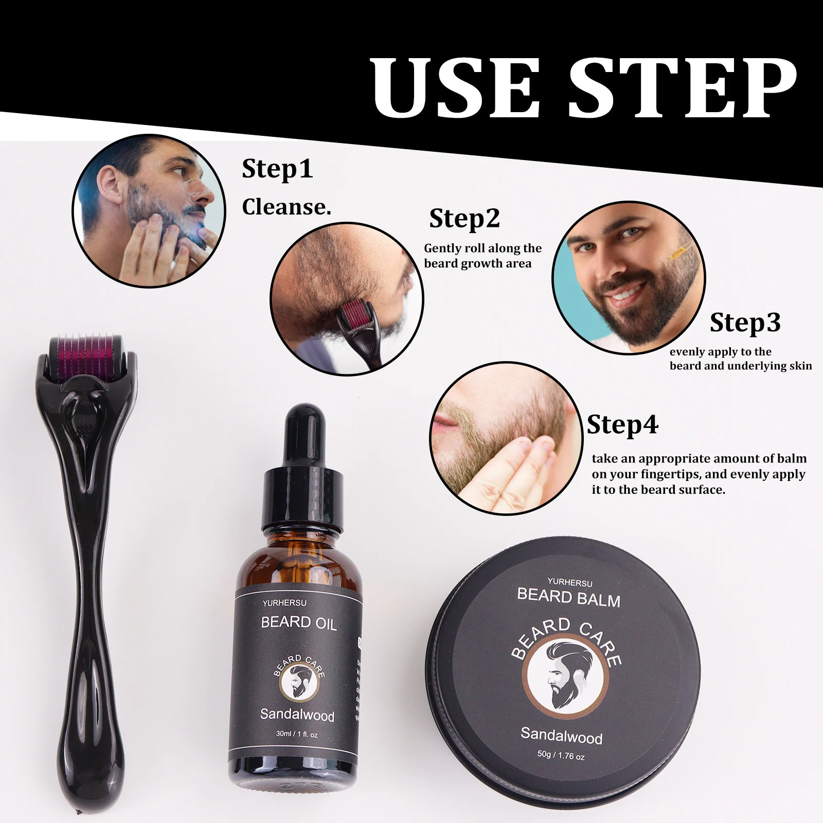 - Kit Contents: Beard Balm (50g) x1, Beard Oil (30ml) x1, Beard Roller x1